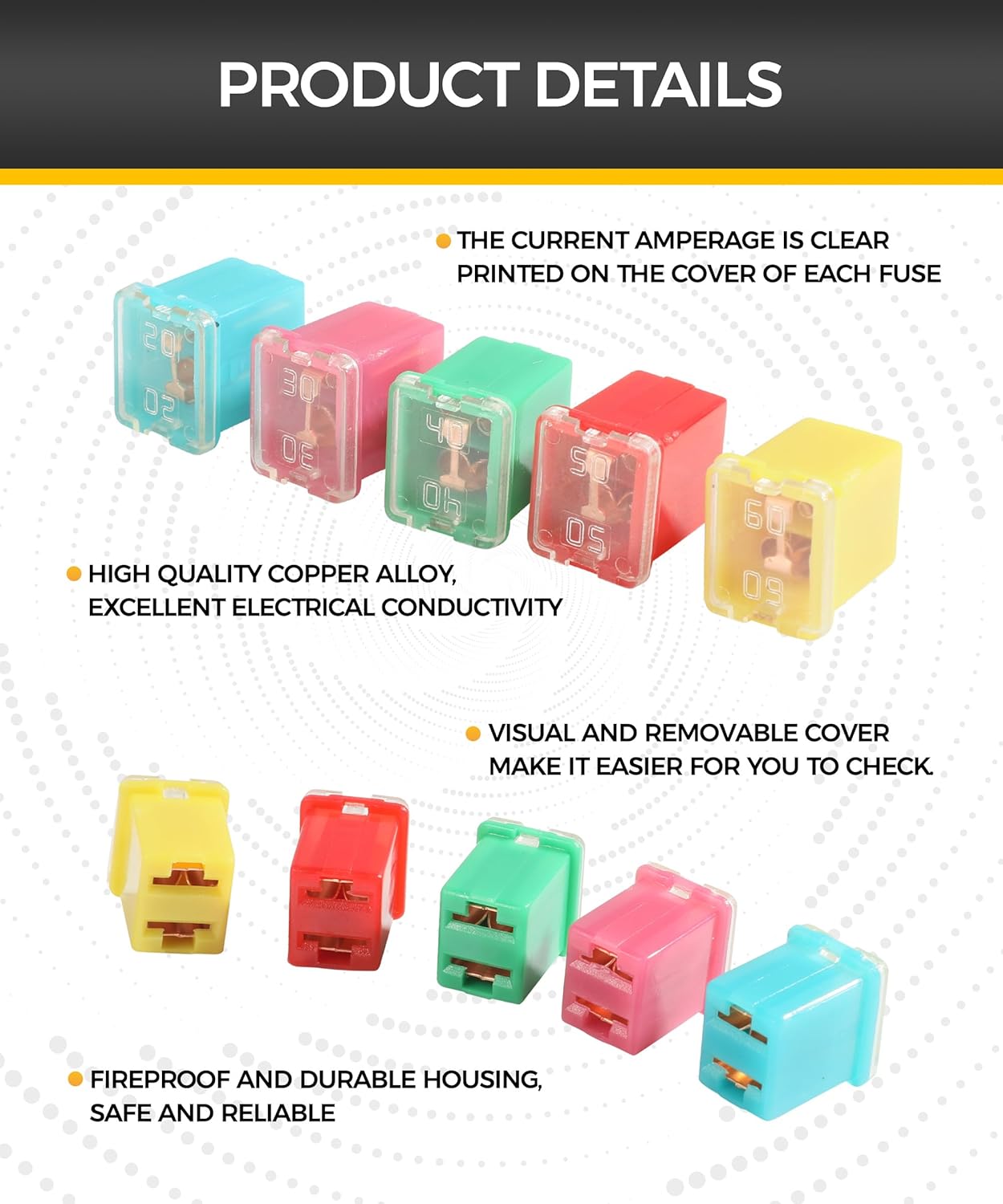 [Package Contents] You will receive 10 fuse combination kits, including 5 different colors of fuses. The rating of each fuse is blue 20A*2, pink 30A*2, red 50A*2, yellow 60A*2, green 40A*2.