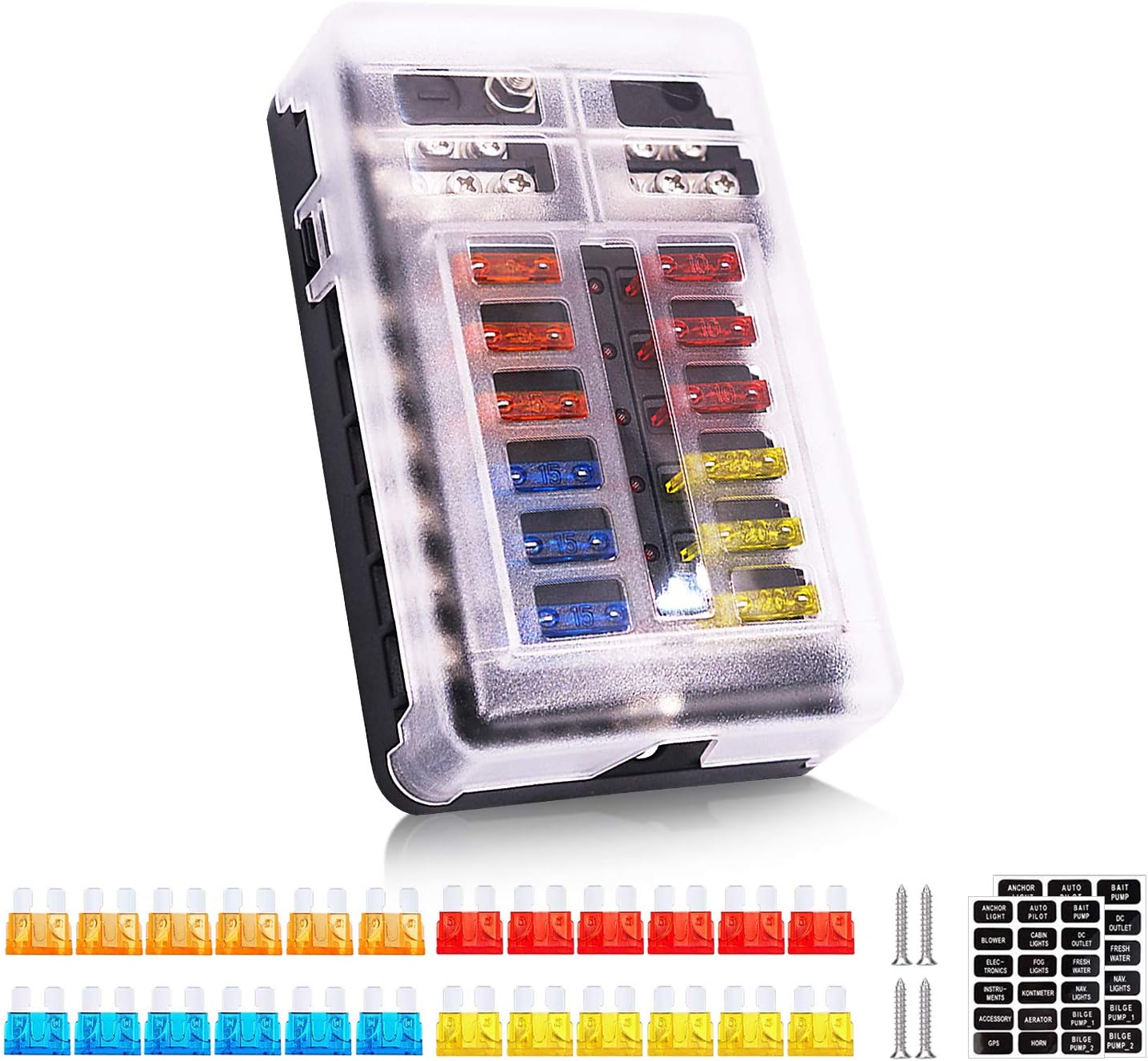 Package Include: 1*12 Way Fuse Box 6*5A Orange Blade Fuse 6*10A Red Blade Fuse 6*15A Blue Blade Fuse 6*20A Yellow Blade Fuse 2*Sticker 4*Screws