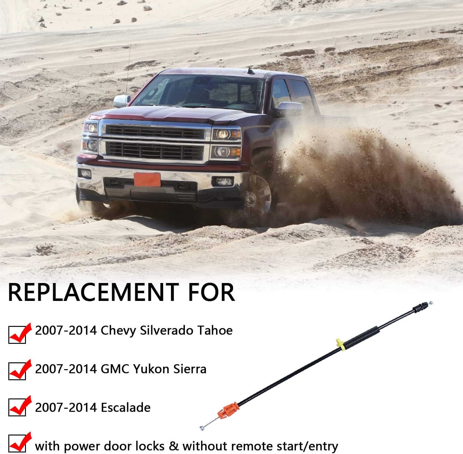 FIT VEHICLES: The door cable Exactly designed for Chevrolet, compatible with 2007 2008 2009 2010 2011 2012 2013 2014 Chevy Silverado Tahoe / GMC Yukon Sierra / Escalade with power door locks & without remote start/entry, sutable for Driver or Passenger side front doors.