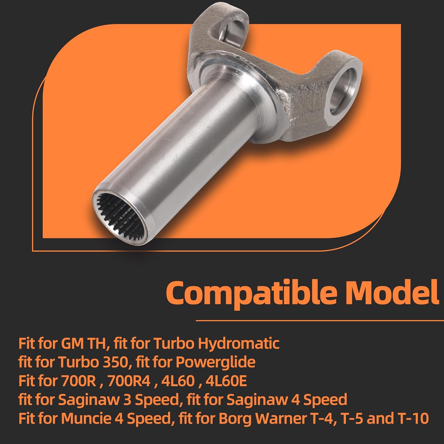 ▶Compatible Model— Transmission Slip Yoke Fit for GM TH, fit for Turbo Hydromatic, fit for Turbo 350, fit for Powerglide; fit for 700R , 700R4 , 4L60 , 4L60E , fit for Saginaw 3 Speed, fit for Saginaw 4 Speed; fit for Muncie 4 Speed, fit for Borg Warner T-4, T-5 and T-10