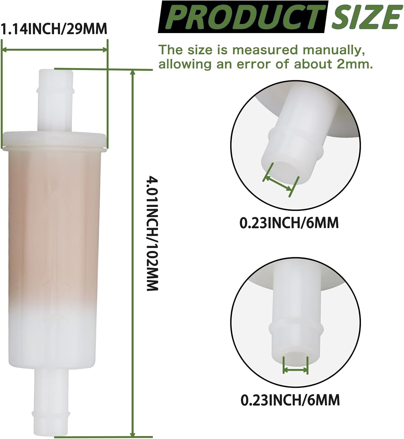 Air Filter Size: For 3/8 inches inside diameter fuel hose.(1.14 x 1.14 x 3.98 inches) Package included: 2 x fuel filter.