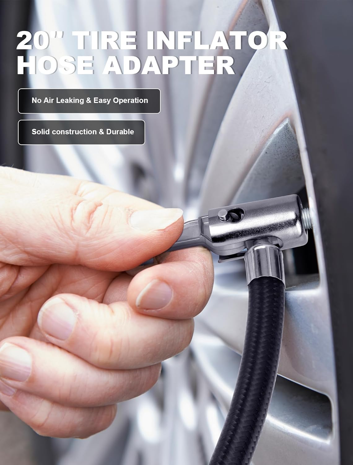 ➤【20 Inch Lengthened & Flexible】20” extended tire inflator/pump hose adapter with high quality strengthen nylon-wrapped rubber hose, covers more distance and provides more flexible space. Allowing easy access to the tires or other areas that need to be inflated.