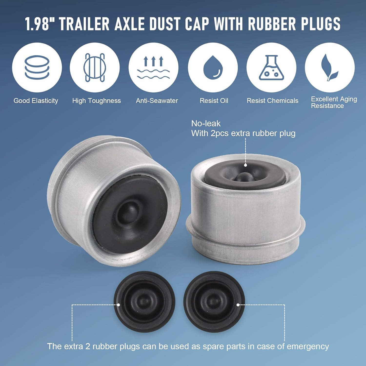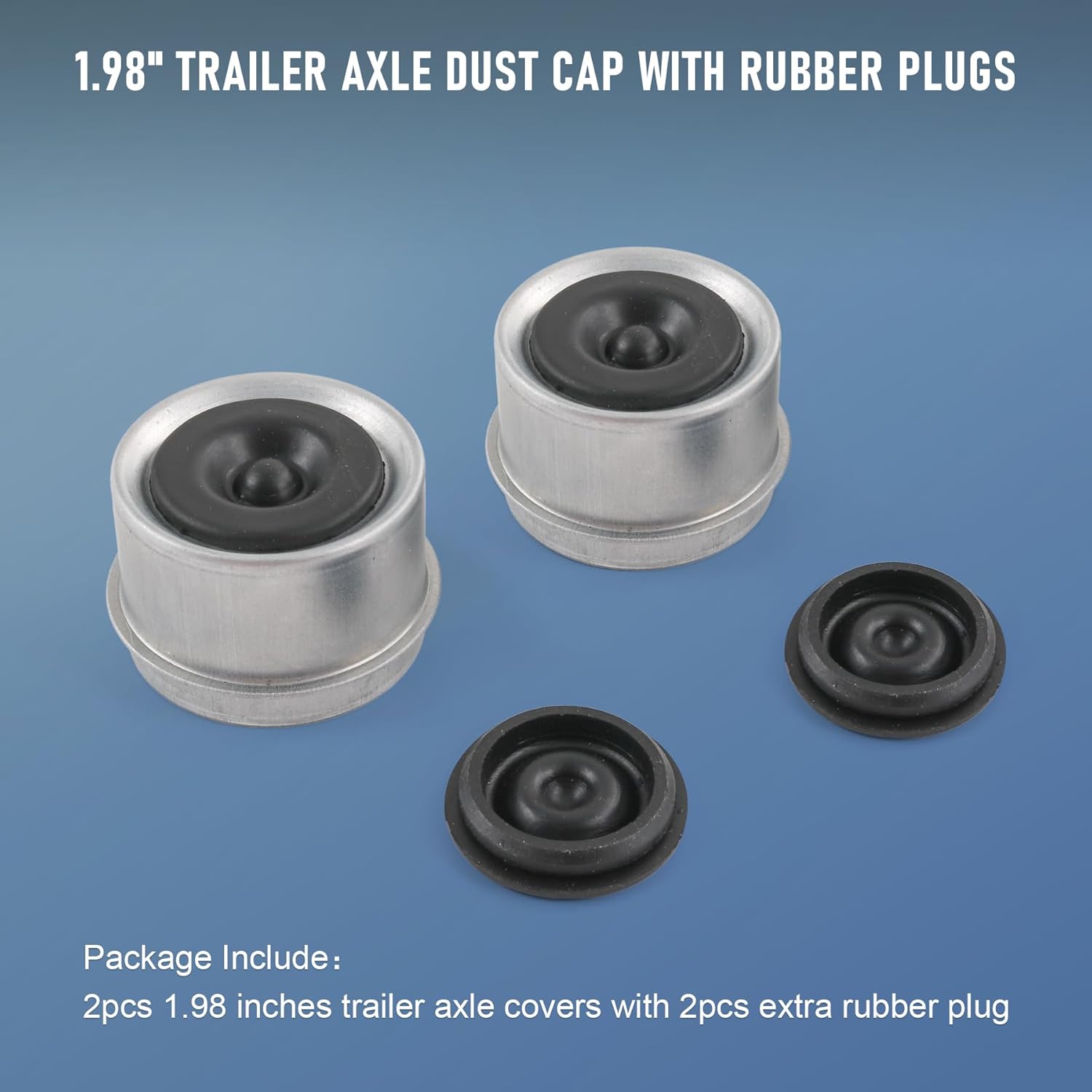Package Include: 2pcs 1.98 inches trailer axle covers with 2pcs extra rubber plug; The extra 2 rubber plugs can be used as spare parts in case of emergency