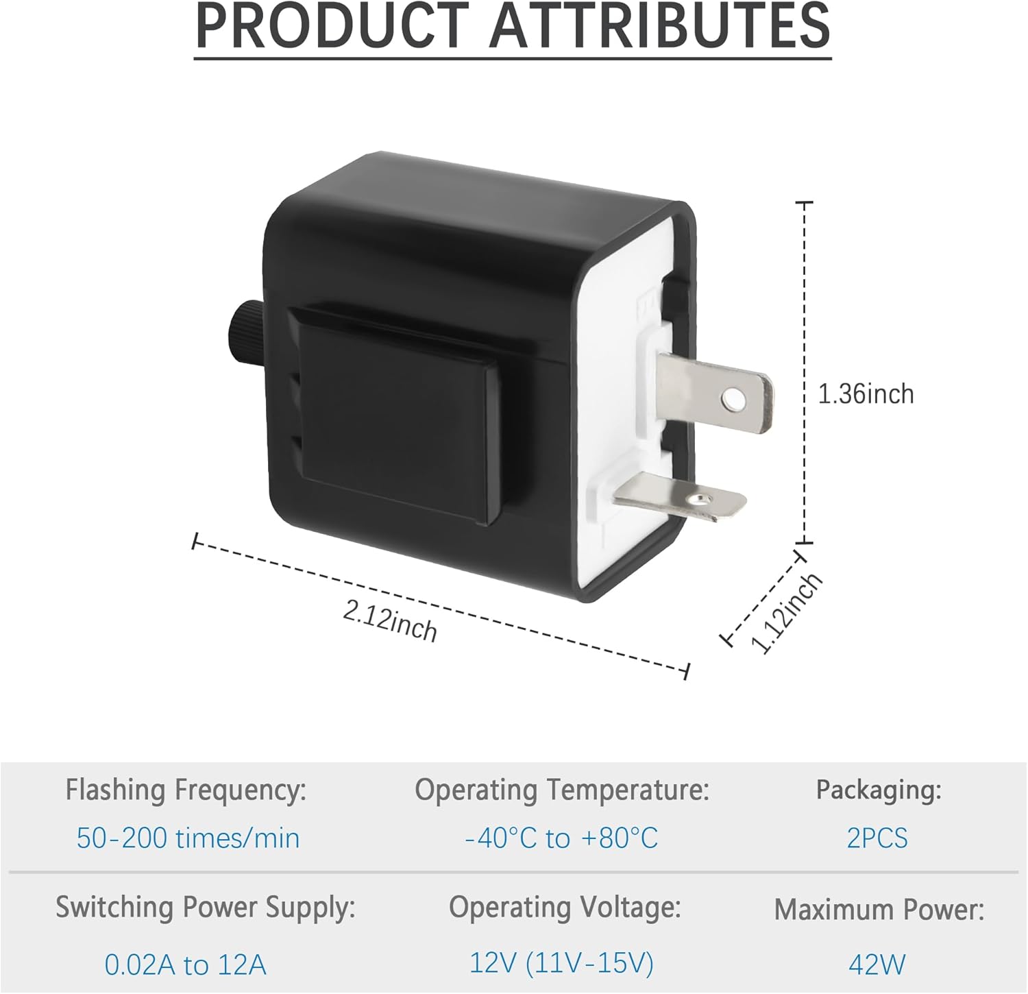 🚘2 Pins LED Flashing Relay – This flasher relay for LED turn signal is 1.36*1.12*2.12 inches in size, blinking frequency is 50-200 times/minute, working voltage is 12V (11V-15V), max power is 42W. Adopting advanced SMD SMD technology, it has a short-circuit, overload automatic protection, which can make the bulb work more stably. You need to check the required product information in detail before placing an order in case of mismatch.
