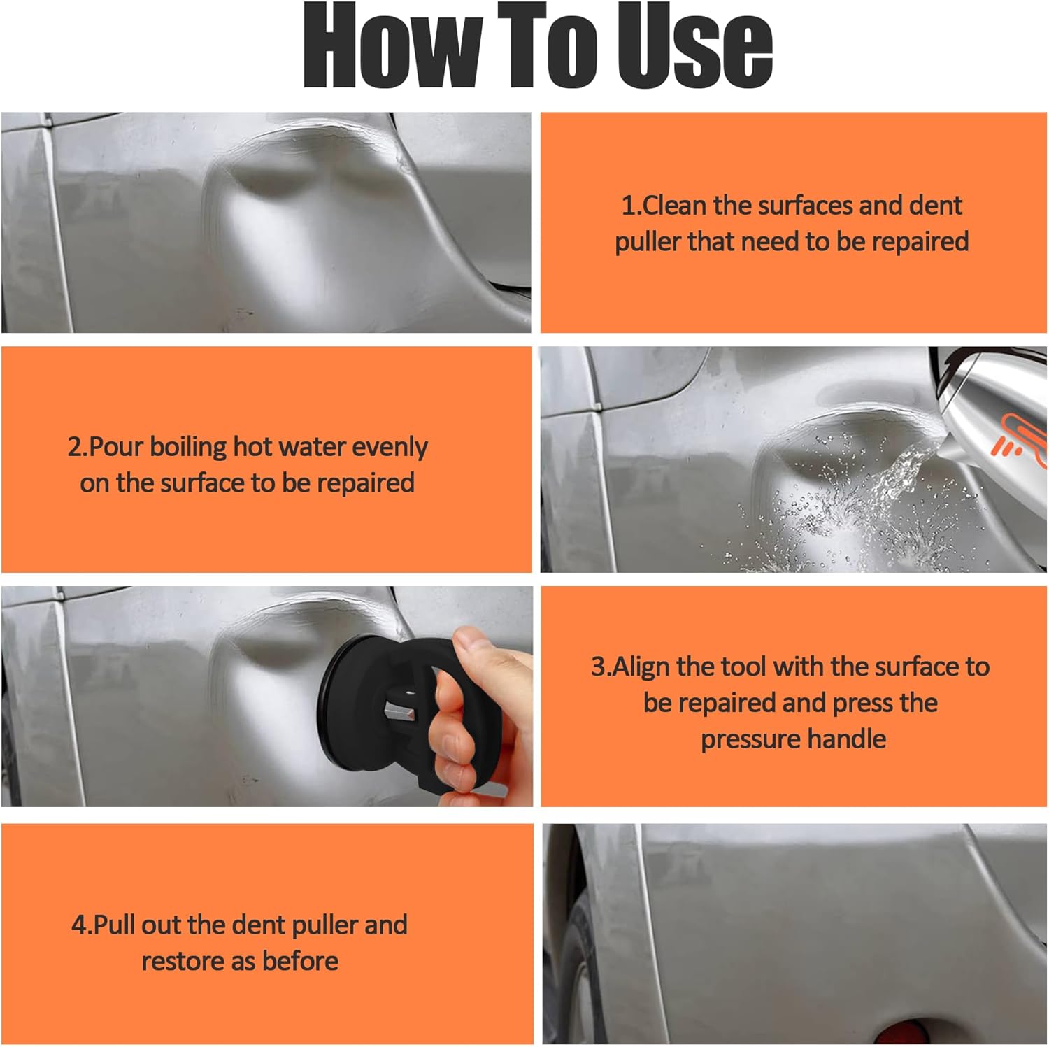 Easy to Use: First, clean the surface and make it dry. Second, adjust the handle of the car dent puller to the separate state. Then, place the suction cup dent puller on the surface and push down to squeeze out the air. Lastly, pull the double handle to the up position and pull the handle hard. This dent removal kit makes car dent repair easy and efficient.
