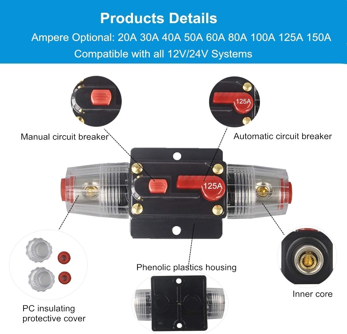 Specification: 125A, 12V-24V DC, compatible with all 12V/24VSystems. Use in place of an inline fuse holder and the unique push button reset can also be used as a Kill Switch.