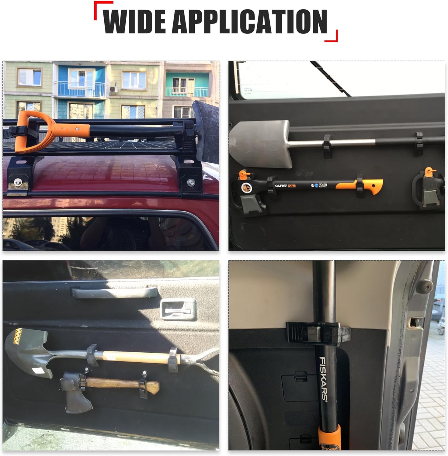 Adjustable and Secure Fit: Rubber hose clamps adapt to diameters between 1-1/5″ and 1-1/2″, securely holding items like flashlights internally and larger tools like shovels or fire extinguishers externally.