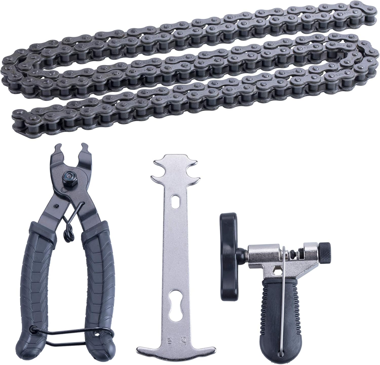Package including: 1pcs 420 roller chain , 1pcs chain breaker kit and 4pcs 420 Chain Connector Link.
