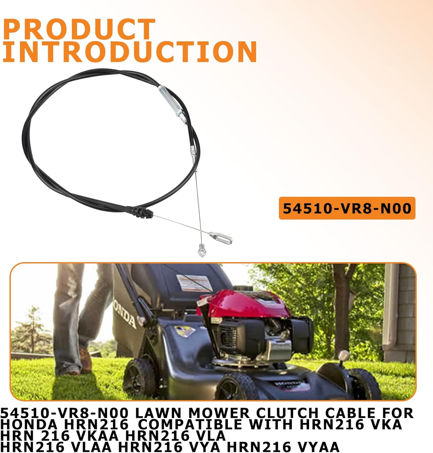 Part Number:54510-VR8-N00 Lawn Mower Clutch Cable for Honda HRN216,Compatible with new Honda models including:HRN216 VKA, HRN 216 VKAA, HRN216 VLA, HRN216 VLAA, HRN216 VYA, HRN216 VYAA.