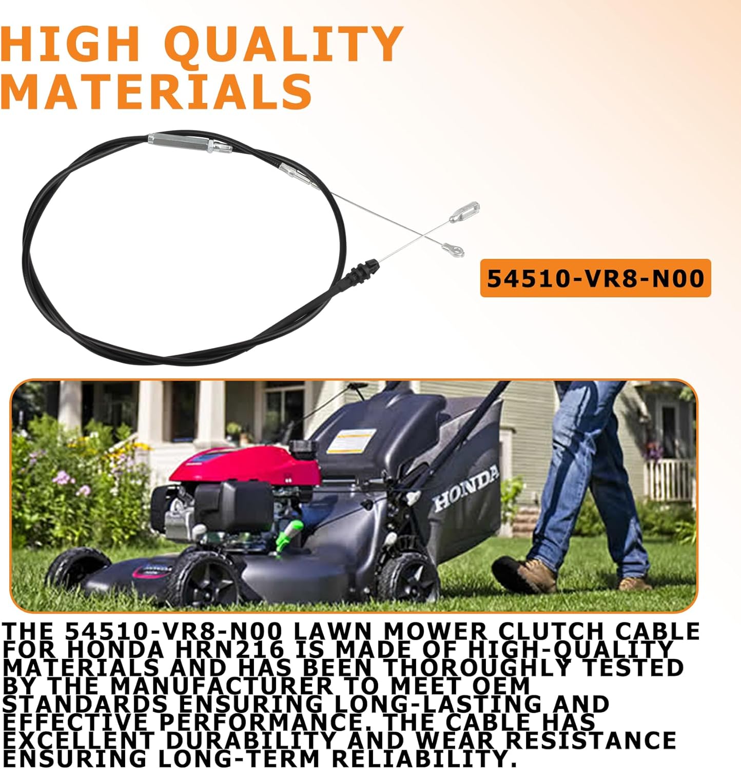 The 54510-VR8-N00 Lawn Mower Clutch Cable for Honda HRN216 is made of high-quality materials and has been thoroughly tested by the manufacturer to meet OEM standards, ensuring long-lasting and effective performance. The cable has excellent durability and wear resistance, ensuring long-term reliability.