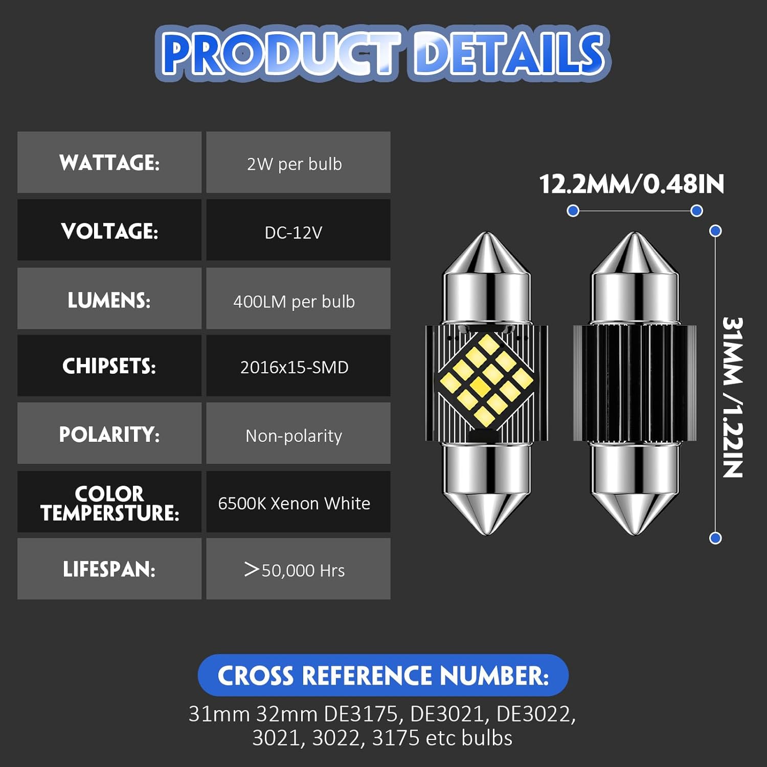 【Universal Compatibility】: With a 1:1 restoration of the original bulb size, these standard DE3175-sized bulbs can replace 31mm 32mm DE3175, DE3021, DE3022, 3021, 3022, 3175, and other festoon bulbs. Suitable for various car interior applications such as dome lights, map lights, door lights, glove box lights, trunk lights, and more.