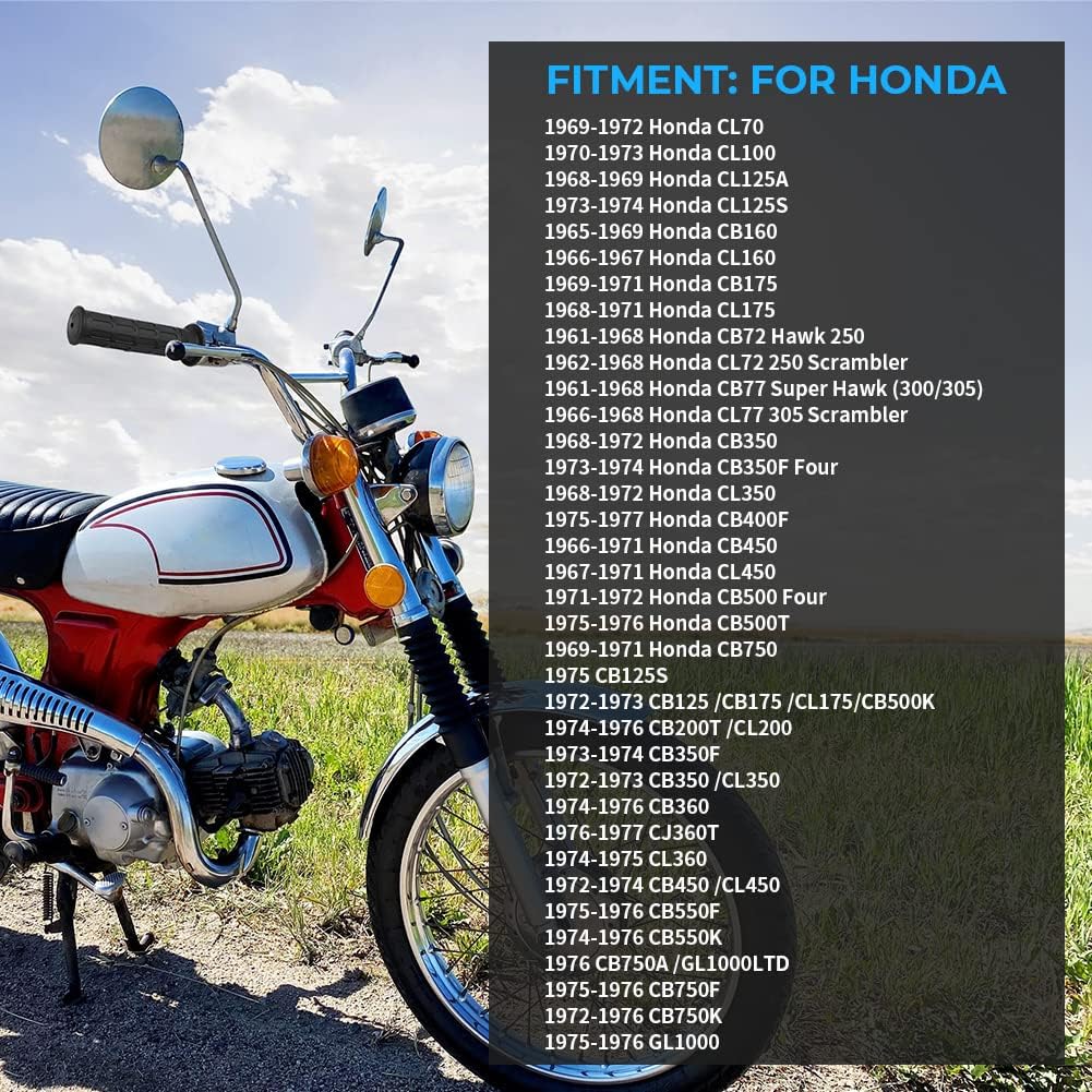 Perfect Fit For Honda:For 1969-1972 CL70 ; 1970-1973 CL100 ; 1968-1969 CL125A ; 1973-1974 CL125S ; 1965-1969 CB160 ; 1966-1967 CL160 ; 1969-1971 CB175 ; 1968-1971 CL175 ; 1961-1968 CB72 Hawk 250 ; 1962-1968 CL72 250 Scrambler ; 1961-1968 CB77 Super Hawk (300/305); 1966-1968 CL77 305 Scrambler ; 1968-1972 CB350 CL350 ; 1973-1974 CB350F Four ; 1975-1977 CB400F ; 1966-1971 CB450 ; 1967-1971 CL450 ; 1971-1972 CB500 Four ; 1975-1976 CB500T ; 1969-1971 CB750