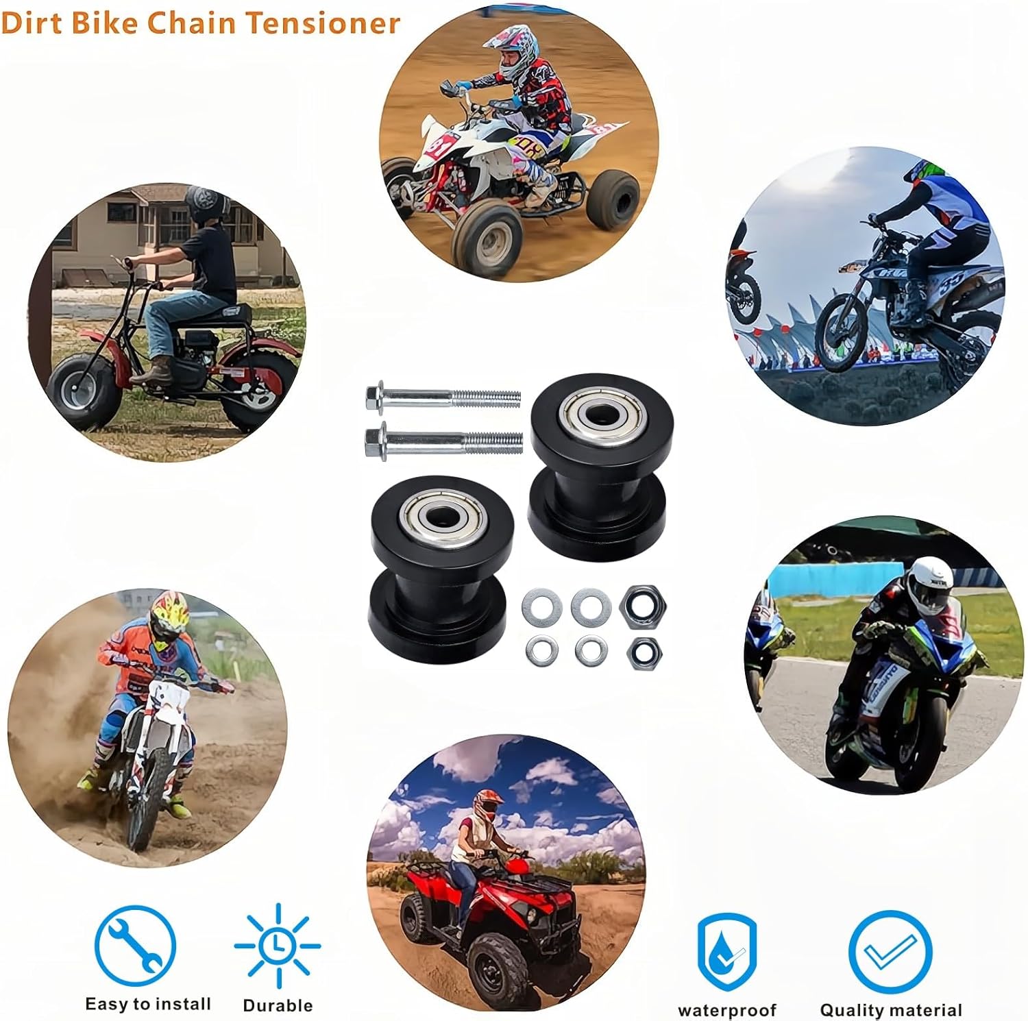 【Chain Roller With Good Compatibility】Fits for most motorized bicycle bike pit dirt bike atv quad and most chinese import pit bikes, is a modified performance good minibike chain tensioner roller, go kart chain tensioner pulley 【High-quality Material】 This chain tensioner pulley is made of high-density durable rubber and metal materials, fine steel bearing is more durable, and waterproof and rust proof, it is an excellent mini bike chain roller 【Easy Installation】The chain roller tensioner is easy to install and easily yours: chain roller 49cc, chain tension roller mini bike 212cc, 125cc chain tensioner ,125cc pit bike chain roller,and roller tensioner for 40 chain, mega moto 80 chain tensioner 【Kit Includes】 Bike chain tensioner, including: 1 x Black 8mm pulley tensioner; 1 x Black 10mm chain roller guide. 2 sets of a mounting screws corresponding to the pulley tensioner 【Use Roller Chain Tensioner Pulley】 This roller chain tensioner, let your motorcycle mini bike Atv 110cc 125cc 140cc 160cc CRF50 KLX110 SSR XR125 chain movement more smoothly