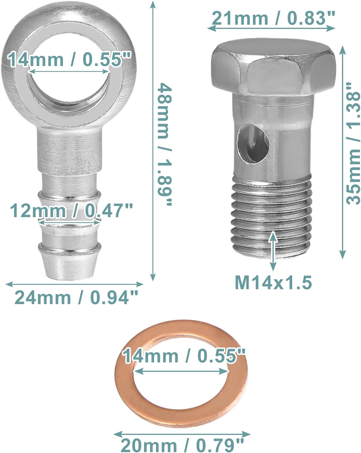 Dimension: Adapter Size: 48x24mm / 1.89″x0.94″(L*W); Banjo Inner Dia.: 14mm / 0.55″; Barb Outer Dia.: 12mm / 0.47″; Washer Outer Dia.: 20mm / 0.79″; Washer Inner Dia.: 14mm / 0.55″; Screw Size: 35x21x19mm / 1.38″x0.83″x0.75″(L*W*H); Thread Size: M14x1.5