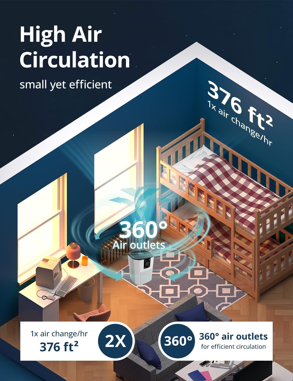 EFFICIENT FILTRATION & EASY TO OPERATE – The air purifier utilizes H13 true HEPA 3-in-1 filters to efficiently filter air output fresh air. Air Spiral technology and 360° air outlet improves the air of 376 ft² area per hour. Smart LED touch control panel, very easy to operate the air cleaner.