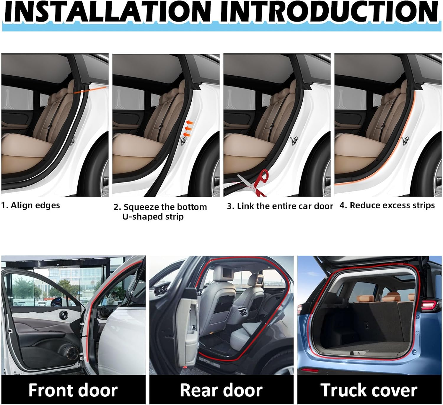 Easy to Install : Four Step Installation -1. Align the sealing strip with the desired edge for installation. 2. Press the U-shaped slot at the bottom to embed the sealing strip on the car door. 3. Connect the entire car door. 4. Cut off excess parts (including metal plates, be careful not to scratch during installation)