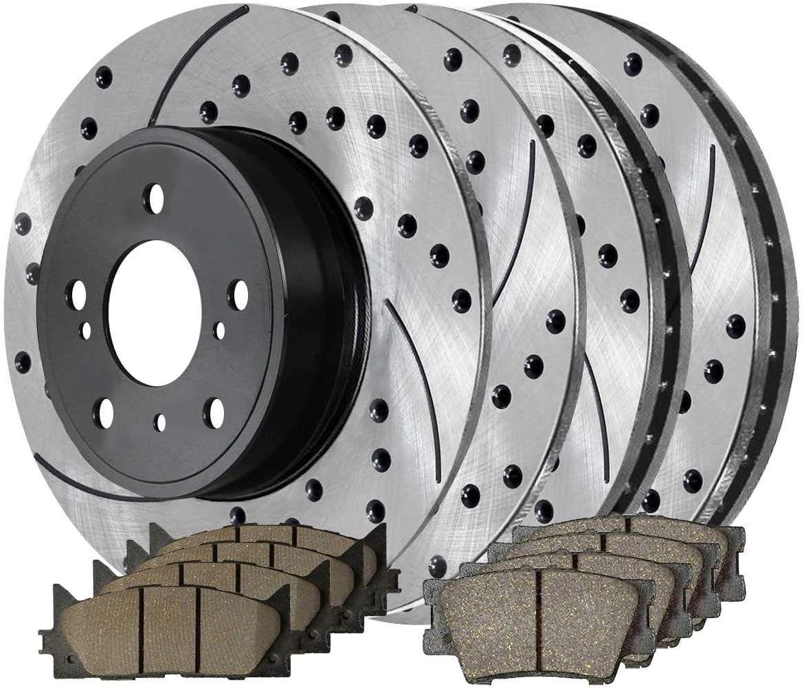 Contains 4 front and rear, driver and passenger side disc brake rotors and 8 ceramic brake pads. Rotors are drilled to help keep the brakes cool, slotted to reduce dirt build-up, and black e-coated to prevent rust and corrosion. Ceramic brake pads produce less noise and dust than metallic pads