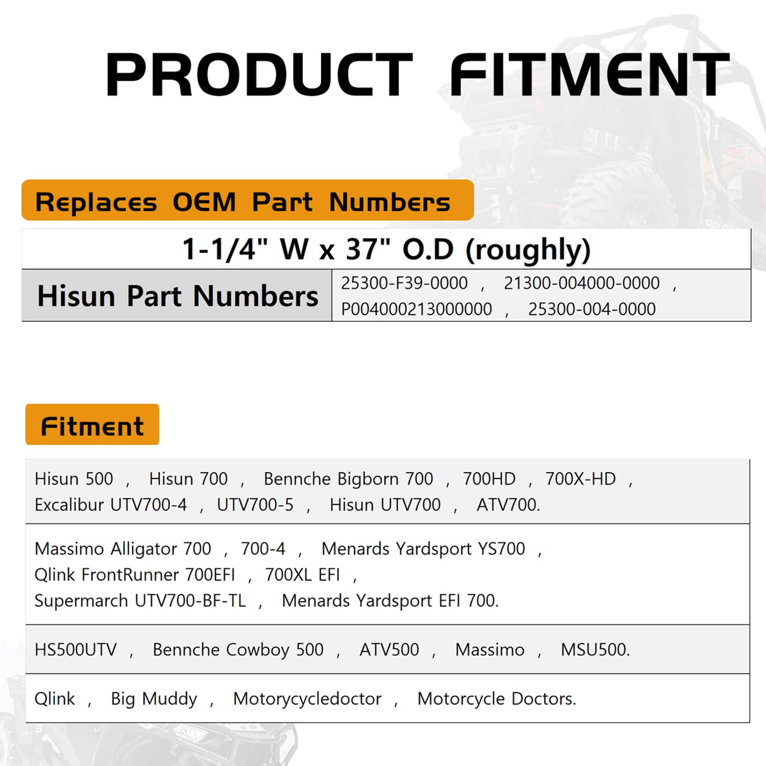 【OEM Reference Numbers】1-1/4″ W x 35-7/8″ O.D (roughly). Hisun Part Numbers: 25300-F39-0000, 21300-004000-0000, P004000213000000, 25300-004-0000.
