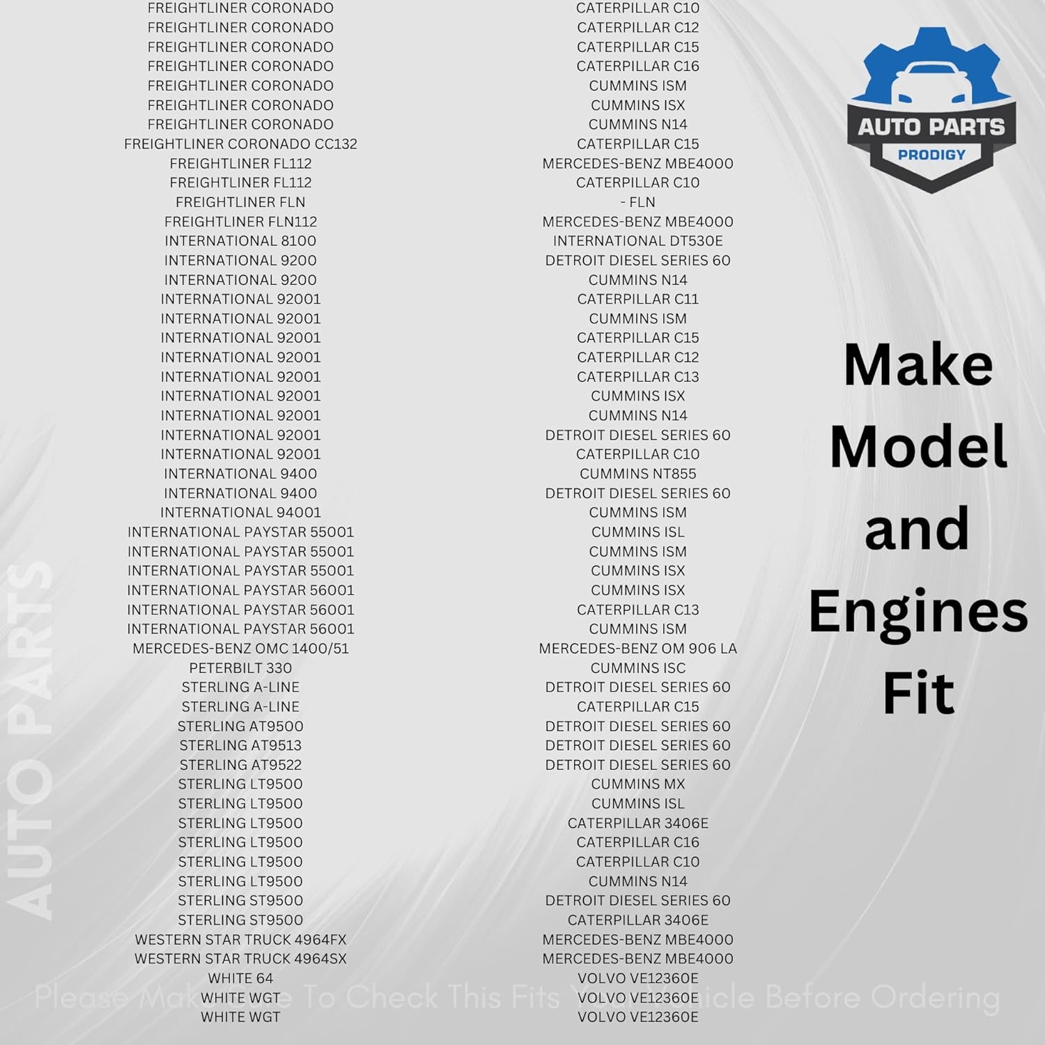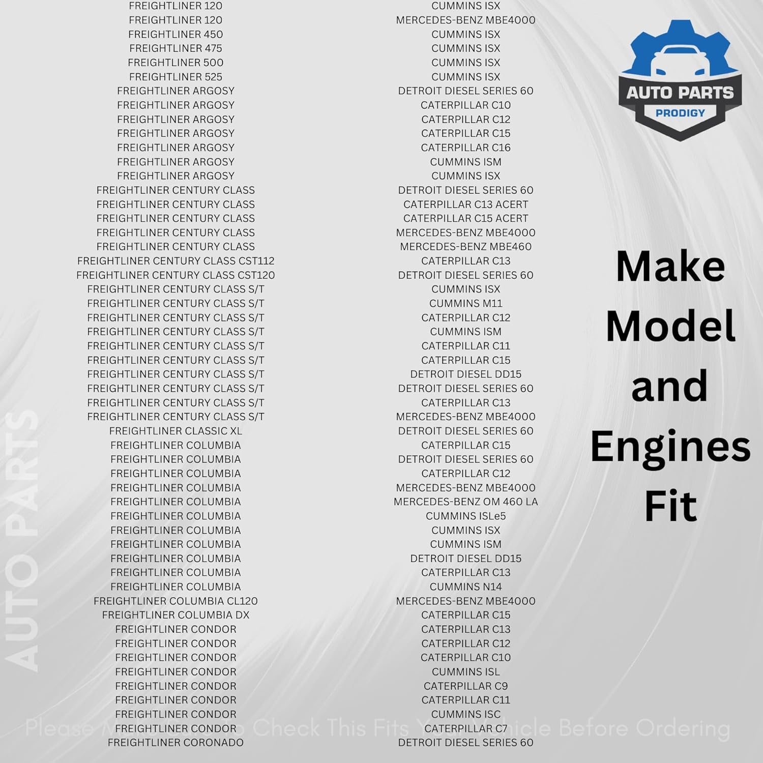 Compatible Engines: Caterpillar 3406E, Caterpillar C7 C9 C10 C11 C12 C13 C15 C16, Cummins ISC ISL ISM ISX, Cummins ISX15, Cummins M11, Cummins MX, Cummins N14, Cummins NT855, Cummins SIGNATURE 600, Detroit Diesel DD15, Detroit Diesel Series 60, International DT530E, Mercedes-Benz MBE4000 MBE460, Mercedes-Benz OM 460 LA, Mercedes-Benz OM 906 LA, Volvo VE12360E