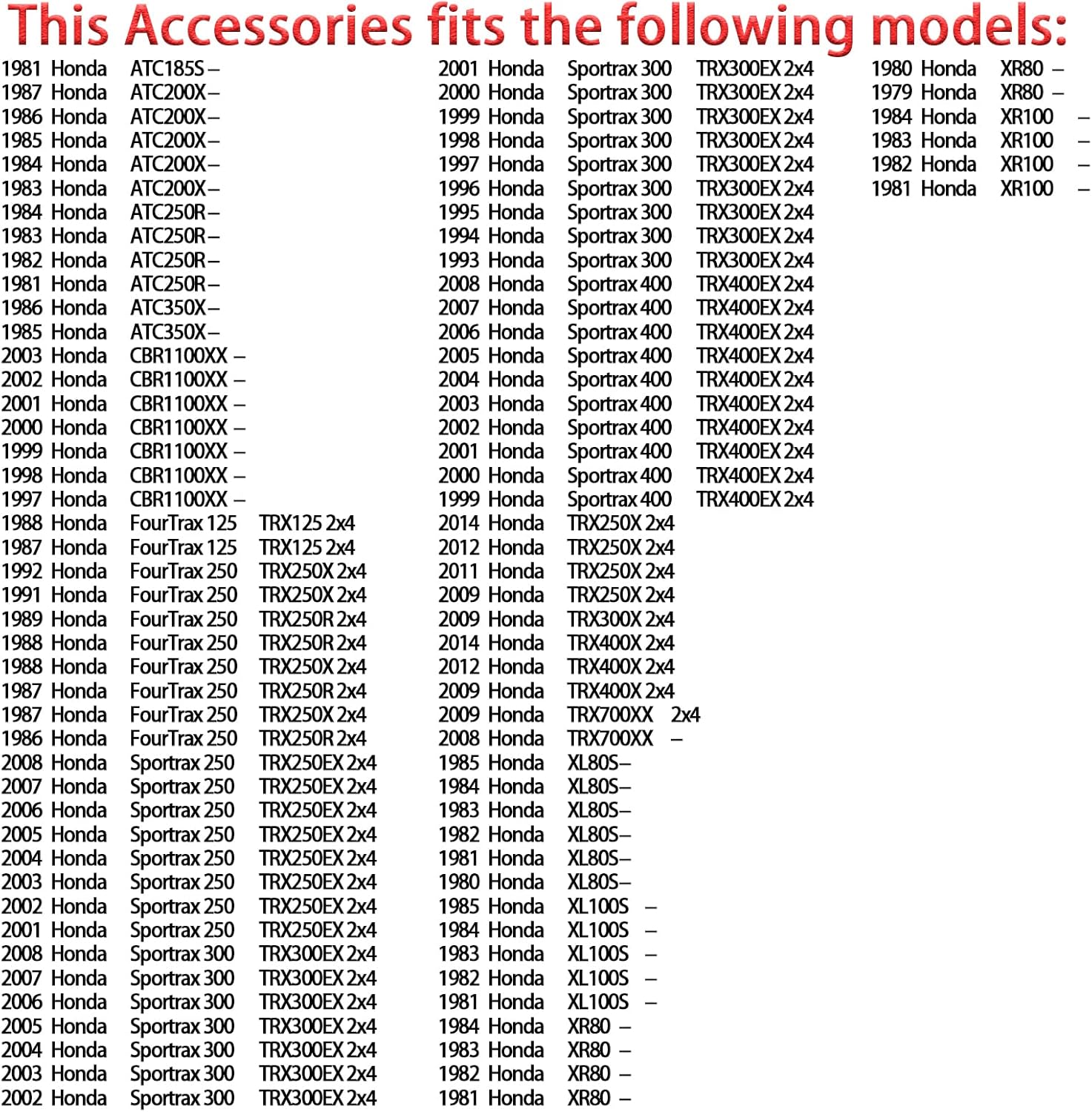 Compatible Models:For Honda Sportrax 300 TRX300EX 1993-2008 Sportrax 400 TRX400EX 1999-2008 TRX250X 2×4 2009 2011-2012 2014 TRX300X 2×4 2009 TRX400X 2×4 2009 2012 2014 TRX700XX 2008-2009 XL80S 1980-1985 XL100S 1981-1985 XR80 1979-1984 XR100 1981-1984