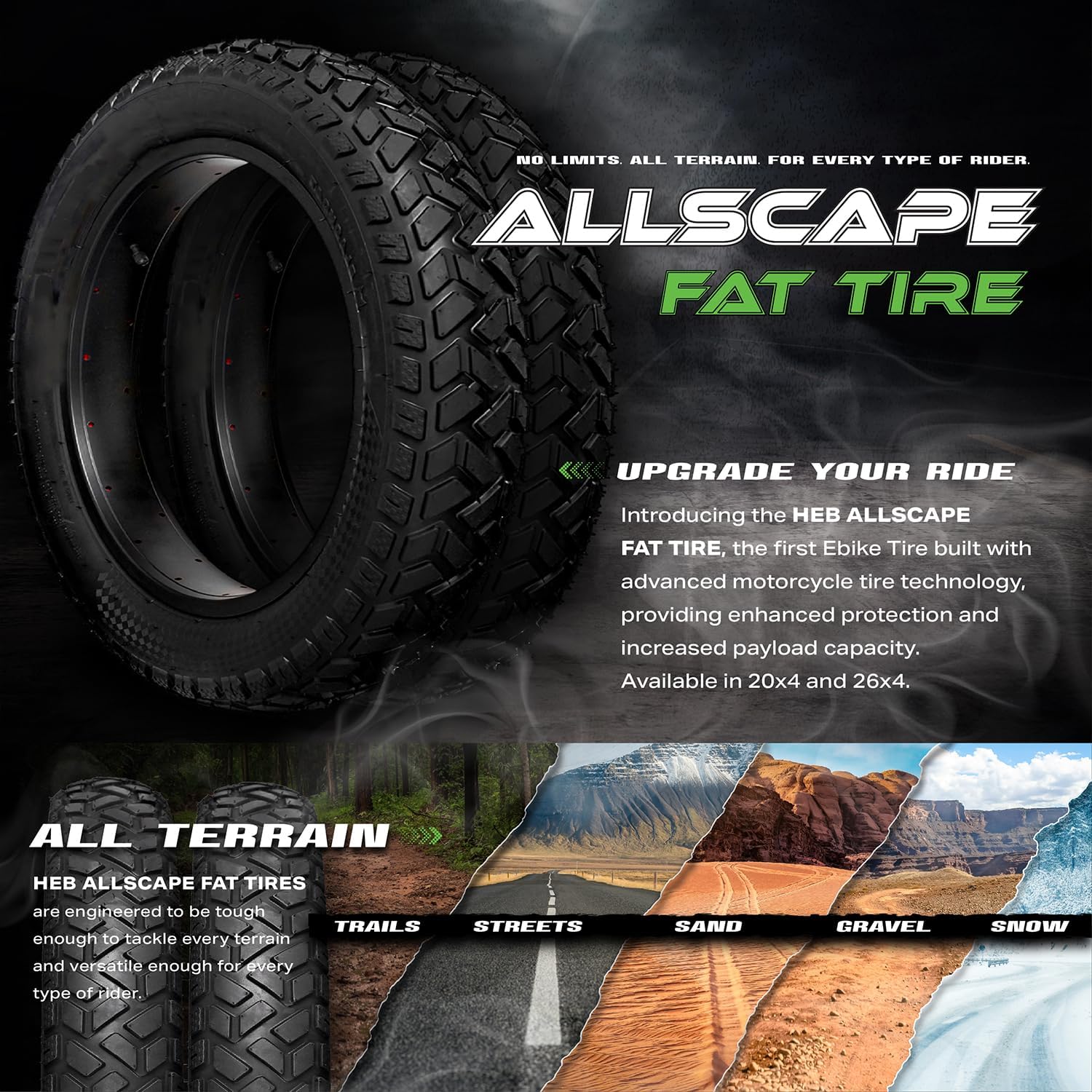 MOTORCYCLE TIRE TECHNOLOGY IN AN E-BIKE TIRE: The HEB ALLSCAPE is built with Motorcycle Tire Technology with HIGH-DENSITY RUBBER with ENHANCED THICKNESS and TREAD QUALITY, which allows for greater load-bearing capacity, and increased durability required for ebikes dealing with increased payload, tread wear, increased torque, etc.