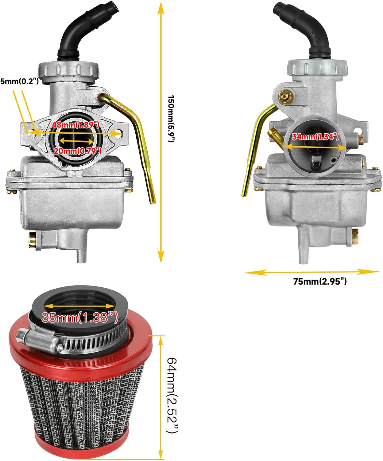 Fuel-saving and High Performance: The PZ20 carburetor is not only more powerful than the PZ19, but also more fuel efficient than the PZ22.This carburetor is made of high quality material ,it will mixes fuel and air well and keep your engine running smoothly.The 35mm air filter effectively filters dust and sand from the air, increasing power, ensuring smooth engine operation and extending engine life.