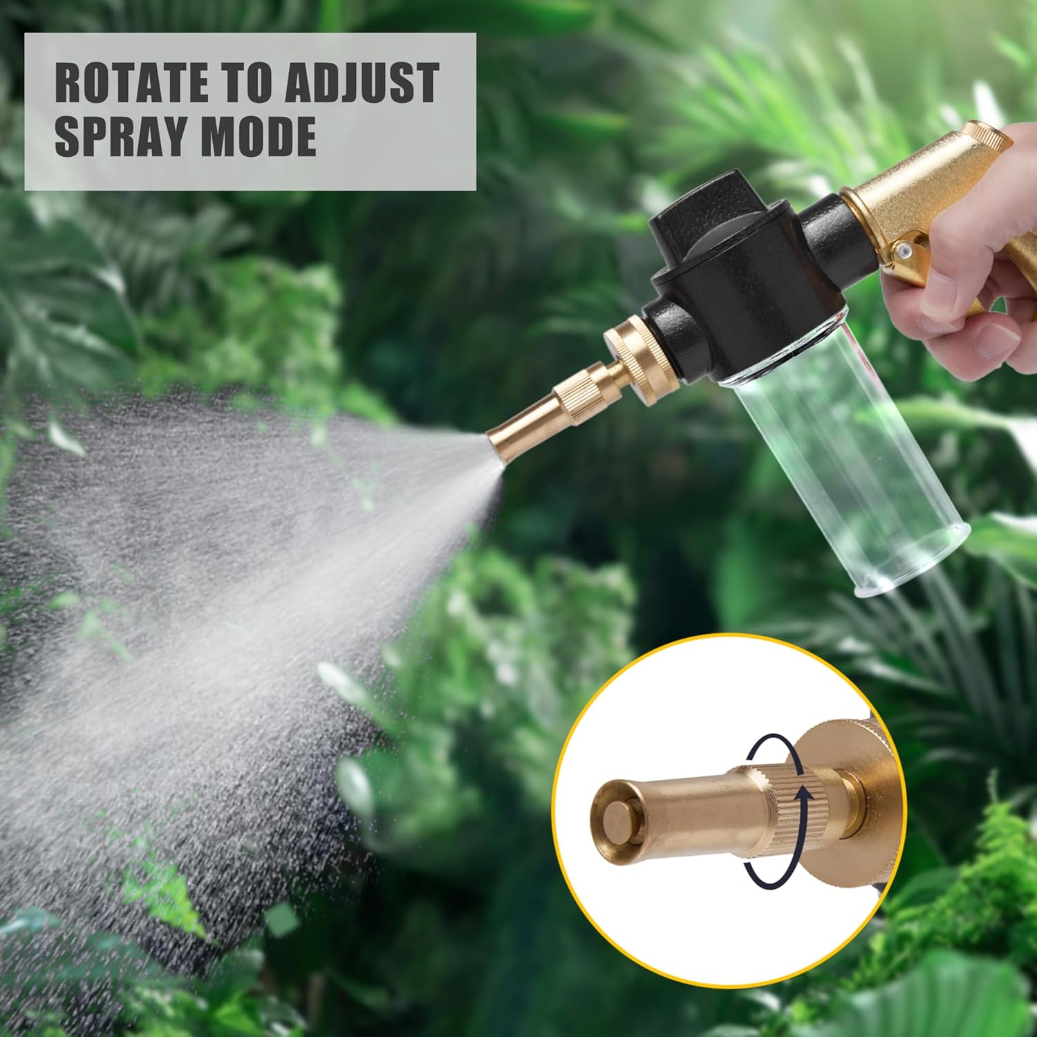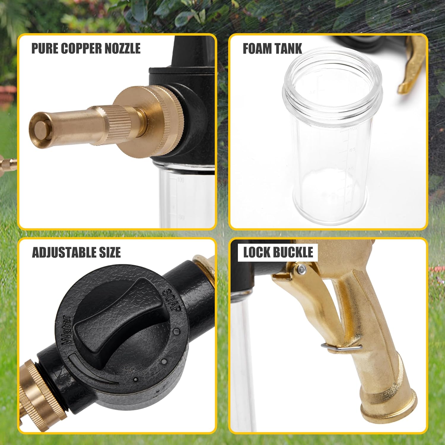 【Metal Gun Body with Plastic Foam Bottle Parts】The foam sprayer has brass adjustable hose nozzle and zinc alloy gun body, durable and powerful. Gun is much stronger than all plastic ones. Comes with 3.5oz/100cc Plastic Soap Dispenser Bottle, just put the detergent into the bottle,and will be combined with water.
