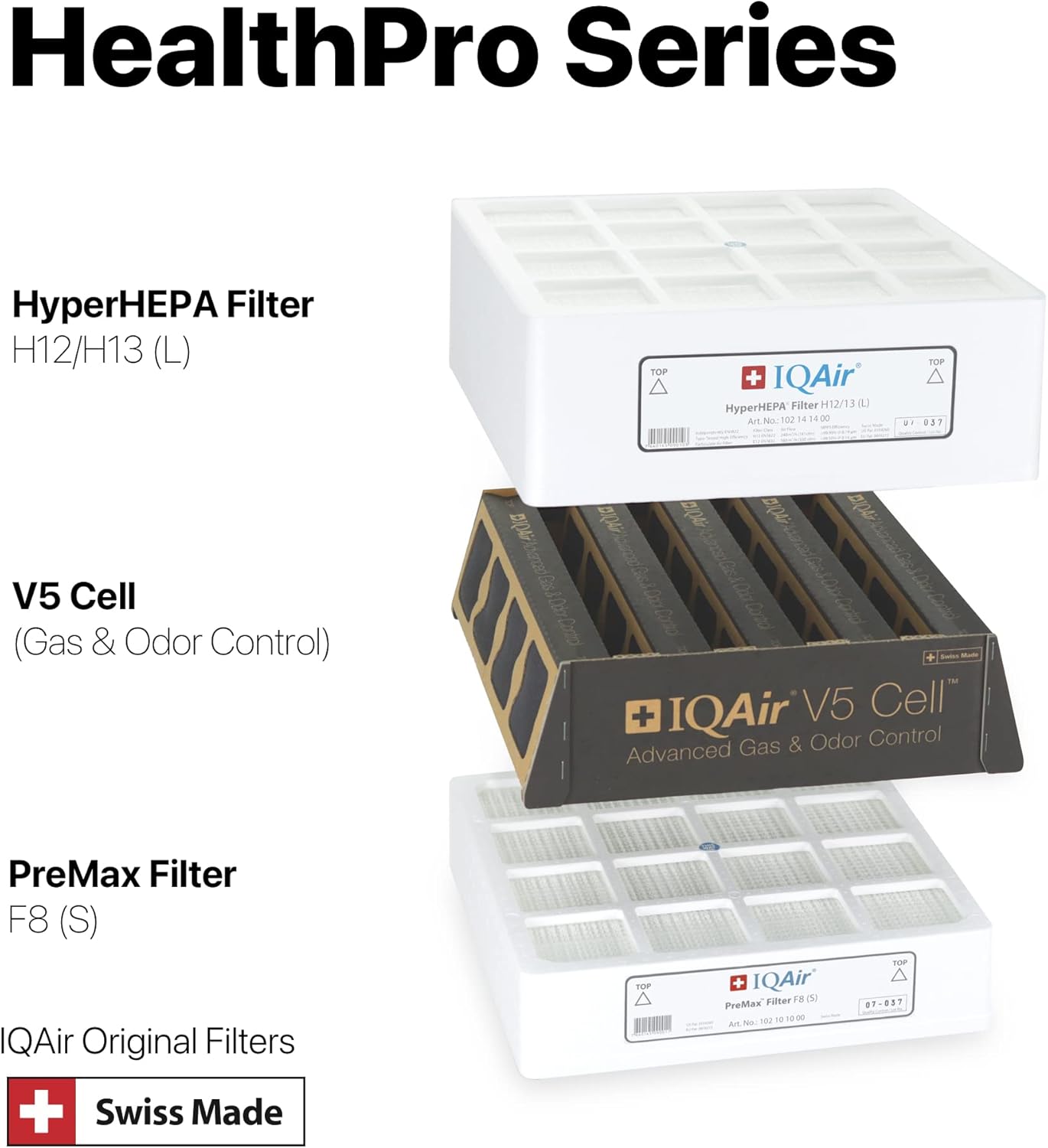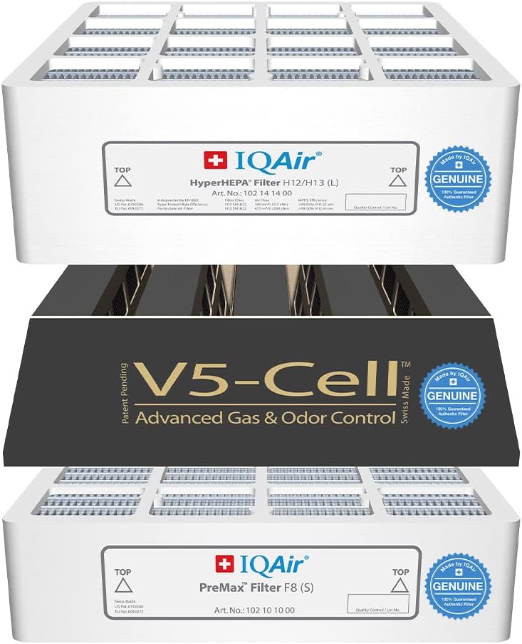 REPLACEMENT FILTER BUNDLE: Genuine replacement filters from IQAir! Designed for our advanced HealthPro Plus room air purifiers, this 3-in-1 IQAir filter bundle includes three long-lasting replacement filters: PreMax Pre-Filter, V5-Cell Gas and Odor Control Filter, and HyperHEPA Filter.