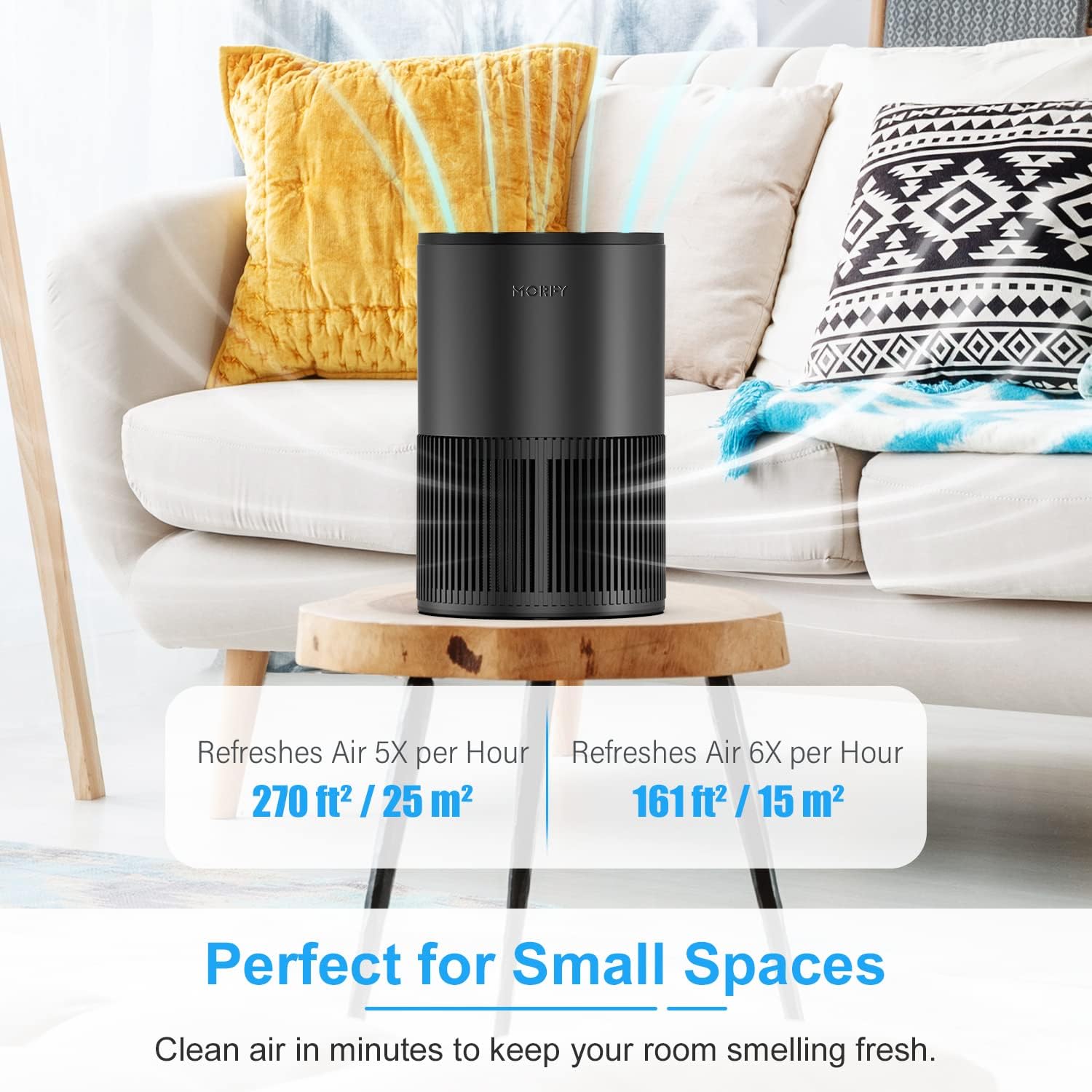 EFFECTIVE PURIFICATION: MORFY Air purifier equip with H13 True HEPA Filter and high-efficiency filter system, refreshing the air 5x per hour in rooms as large as 270 ft² / 25 m².The compact frame and 360°design help the air purifier purify the air wherever you put it, such as bedrooms, living rooms, kitchens, tabletop, desk, shelf or office.This air cleaner is a nice size for a small/medium room, or as an additional filter in a large room.