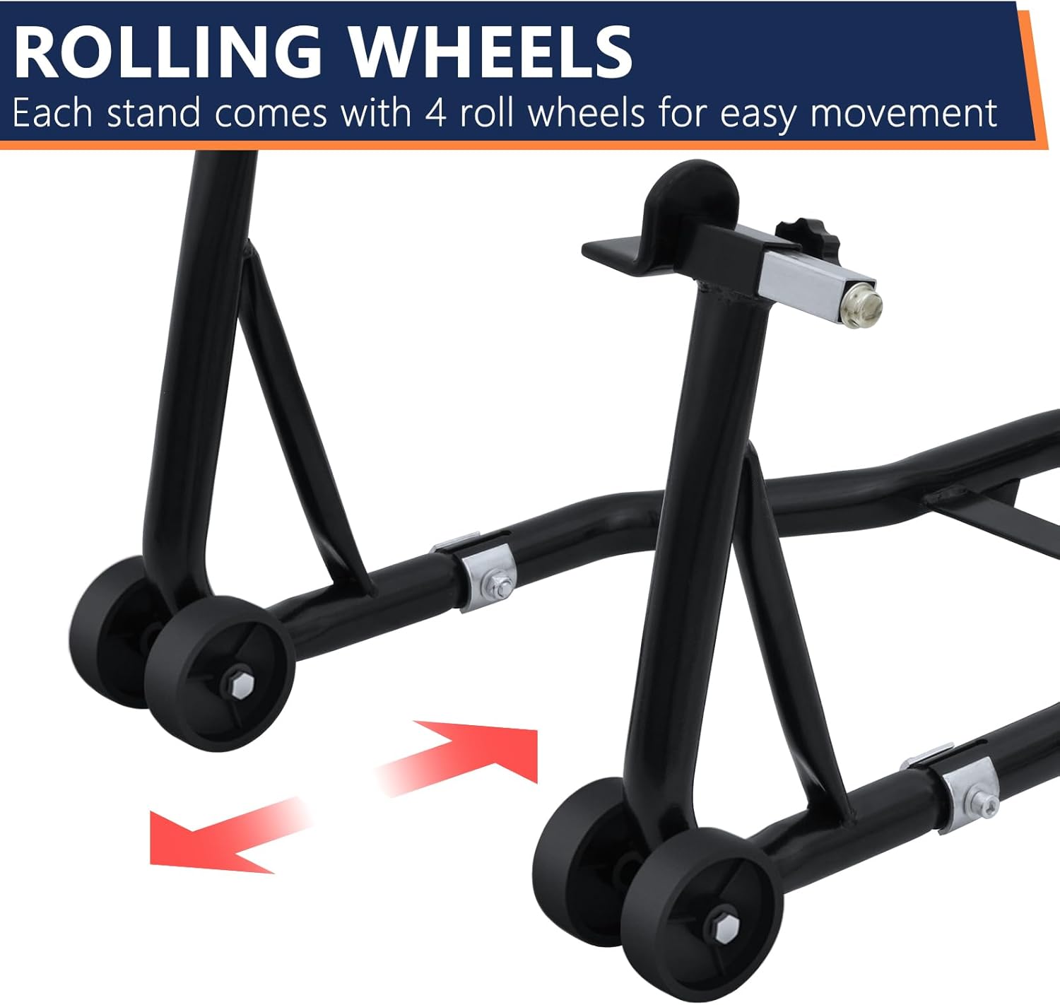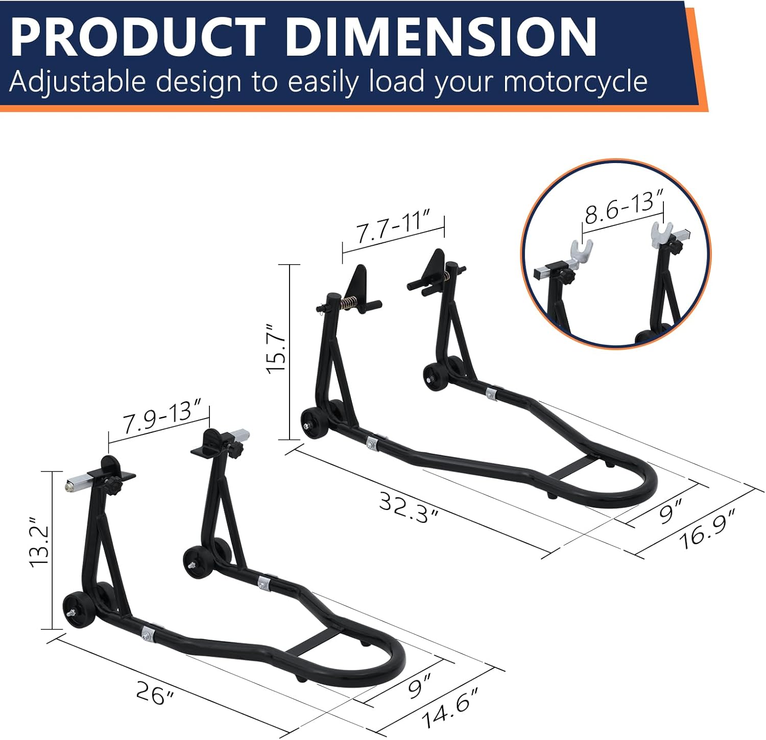 Adjustable Universal Fork Heads: The front stand’s width can be effortlessly modified between 7.7″ to 11″, For the rear stand, equipped with an L-shaped fork head, the adjustment range spans from 7.9″ to 13″, offering enhanced compatibility with various motorcycle models. Additionally, we include an extra pair of L-shaped fork heads, adjustable from 8.6″ to 13″, providing further customization options.