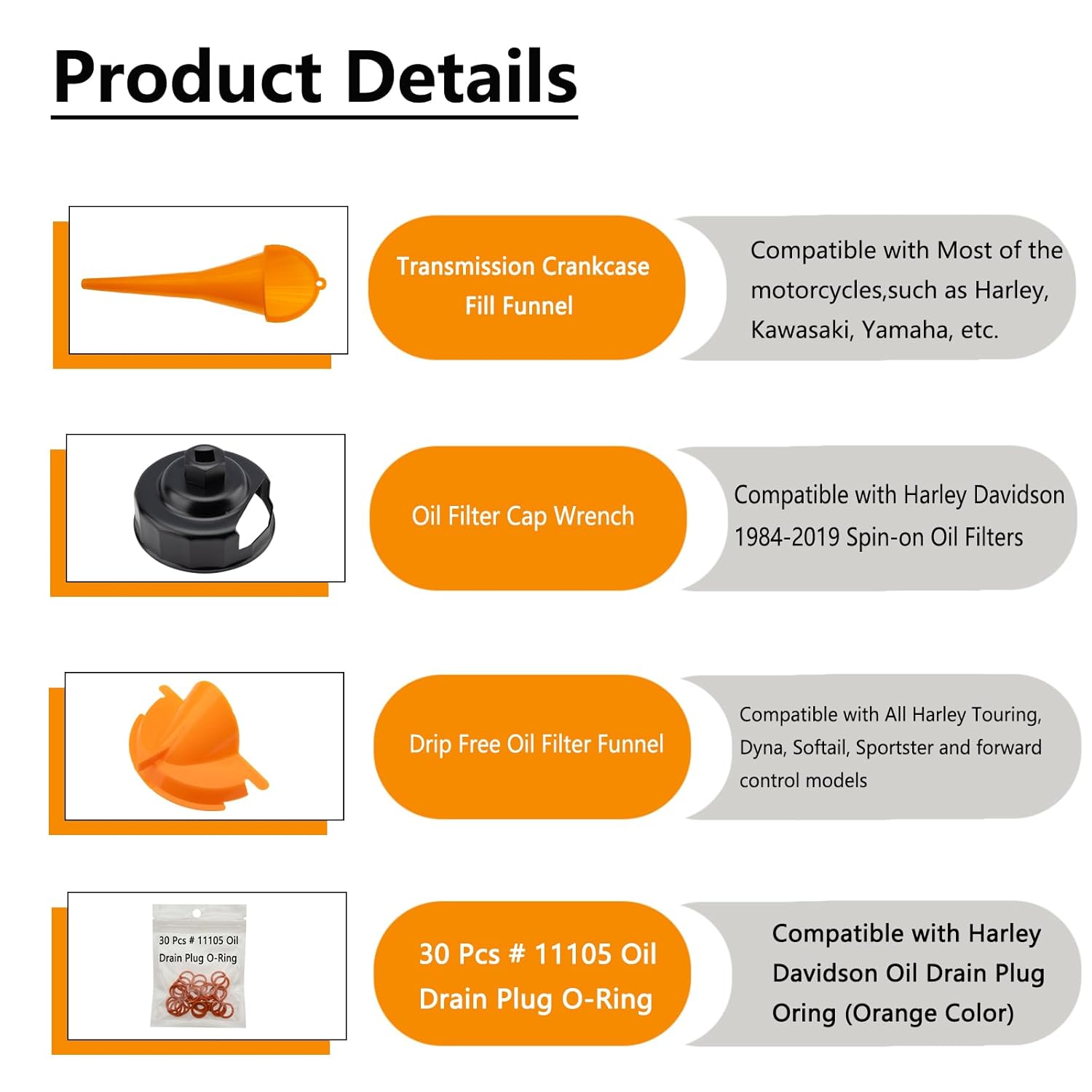 Oil Change Kit Oil Filter Cap Wrench,Crankcase Fill Funnel,Primary Case Oil Funnel,Drip-Free Oil Filter Funnel,30Pcs O-Rings,Compatible with Harley