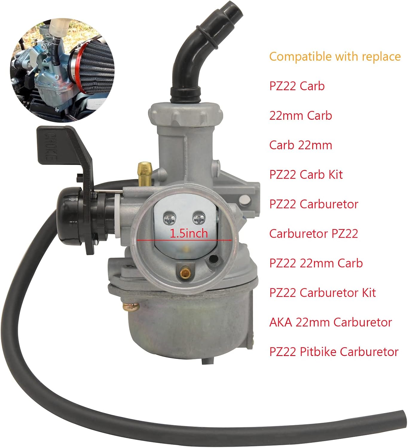 Material: Aluminum. Size:PZ22 This Carburetor usually used on 110cc 125cc 140cc 150cc engines. PZ22 Carburetor replaces many 4-stroke ATVs, Dirt Bikes, Pit bike,Go Karts and Monkey Scooters. PZ22 Carburetor AKA 22mm Carburetor,22mm Carb,Carb 22mm,PZ22 Carburetor Kit,PZ22 Carb,PZ22 Pitbike Carburetor,Carburetor PZ22,PZ22 22mm Carb,PZ22 Carb Kit,PZ22 Carburetor Intake,125cc pit bike carburetor. Package including: 1 Carburetor 1 Air Filter 1 Spark Plug
