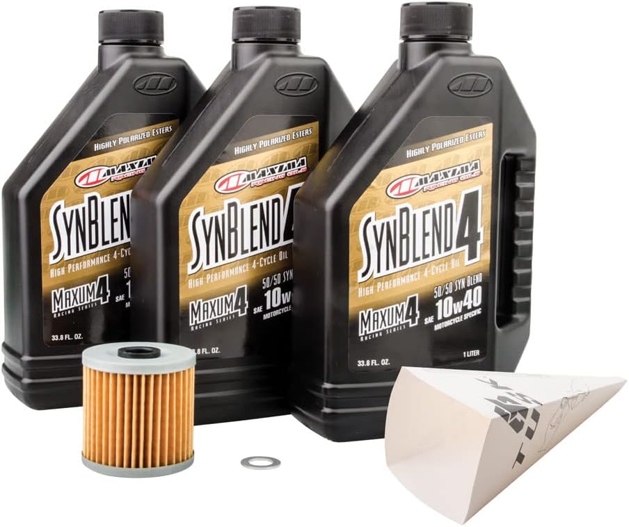 This kit includes the following items: Three 1 Liter bottles Compatible with Maxima Synthetic Blend 4-Stroke Oil Tusk oil filter One Tusk 12M drain bolt crush washer One Tusk Disposable Funnel