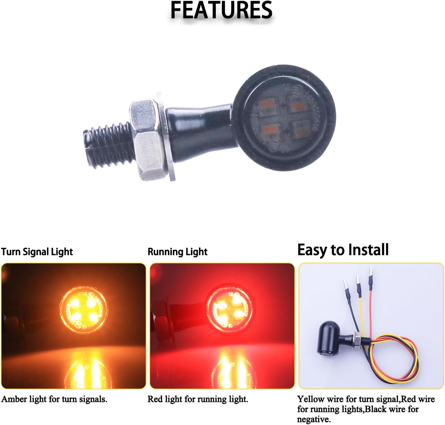 【Durable】Made of high quality ABS plastic material and Metal shell,precision manufacturing,Waterproof,anti-scratch, keep light on even in heavy rainy days; Rear turn signals: Amber light for turn signals, red light for running light; Front turn signals: Amber light for turn signals, white light for running light.