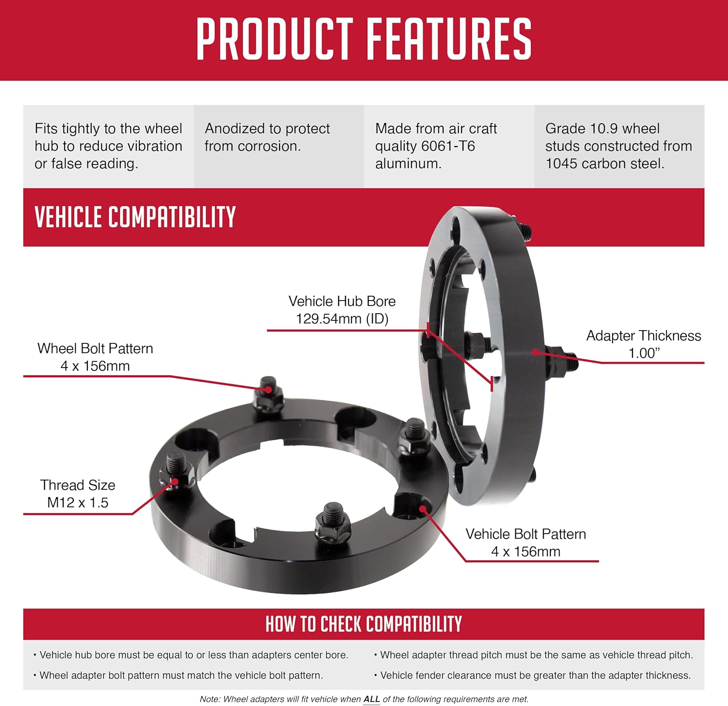 Specs: Thickness: 1.00″ | Forged 6061 T6 Aluminum | Wheel Bolt Pattern: 4 on 156mm 4x156mm | Vehicle Bolt Pattern: 4 on 156mm 4x156mm | ID (Vehicle ): 130mm | OD (Wheel ): 130mm | Thread: 12mm 1.50 12×1.50 | Color: Black | 2 Pcs