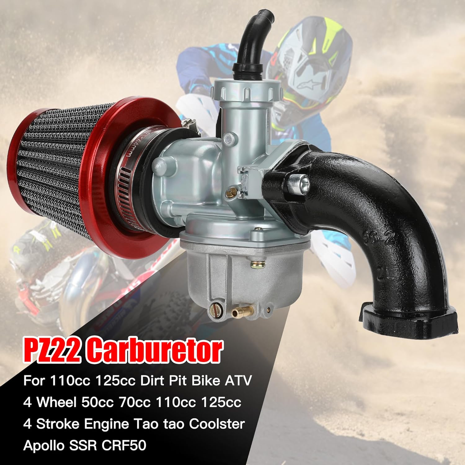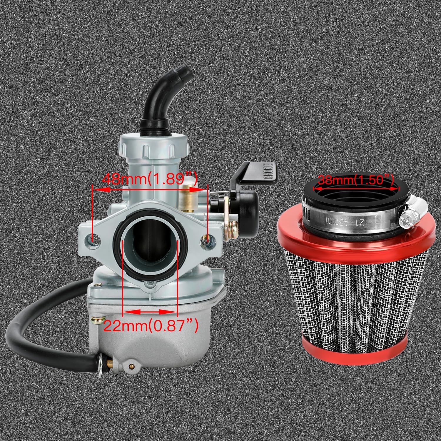 Size: 125CC Dirt Bike Carburetor Intake Inside Diameter : 22mm, Bolting on Side Hole to hole: 48mm. Air Filter Diameter: 38mm.